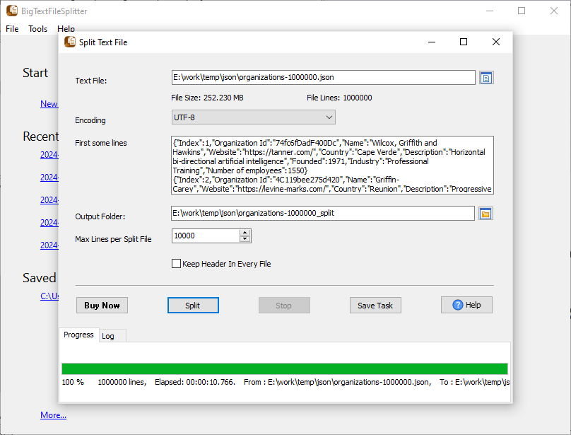 Example of splitting large JSON lines (JSONL / NDJSON / LDJSON) file