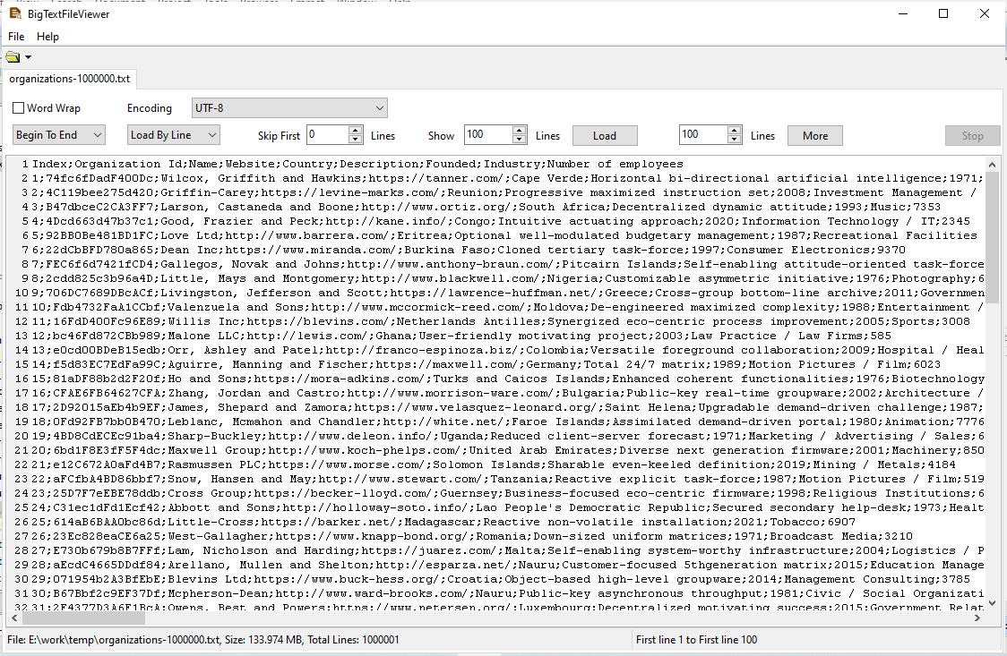 An example TXT (“;” semicolon delimited text) file, viewed in BigTextFileViewer.