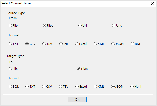 Select source CSV files -> Set JSON files -> Convert CSV files to JSON files