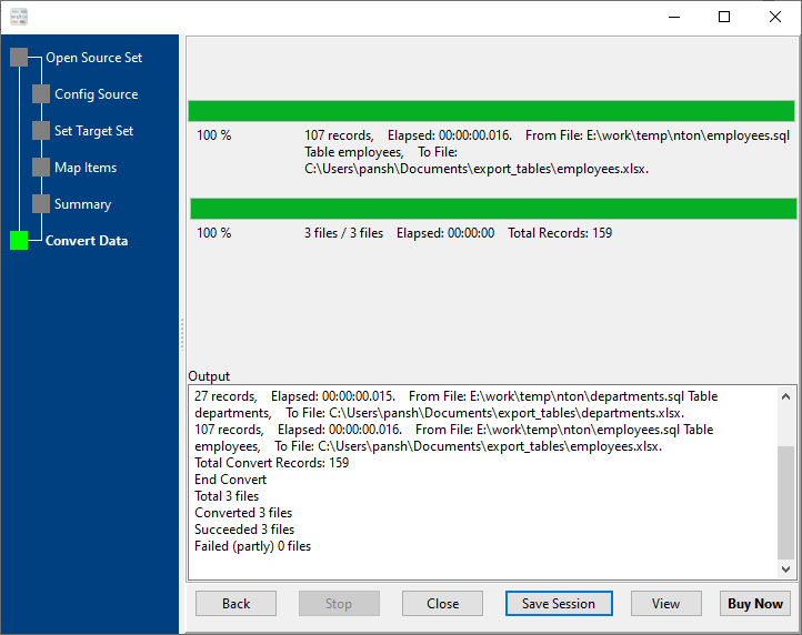 Select source SQL files -> Set Excel files -> Convert SQL files to Excel files