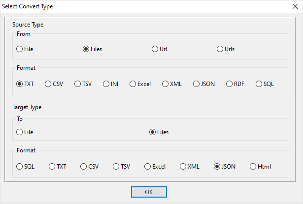 Select source TXT files -> Set JSON files -> Convert TXT files to JSON files