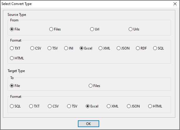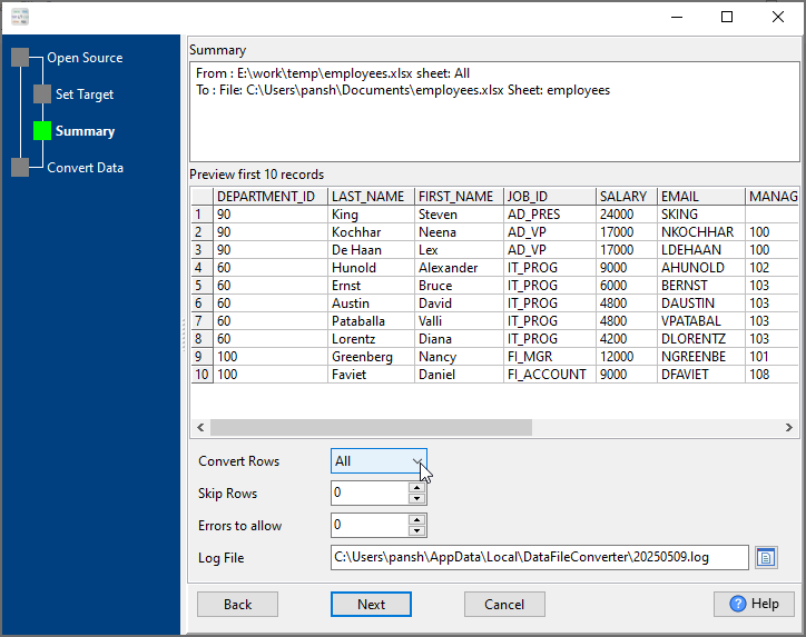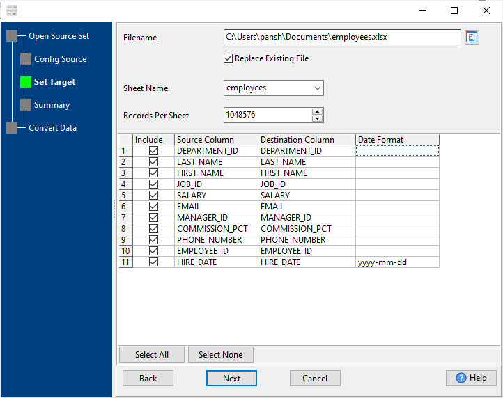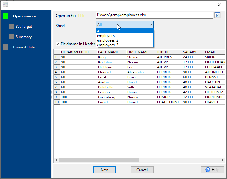 Select source Excel file -> Set target Excel file and sheet -> Merge Excel sheets