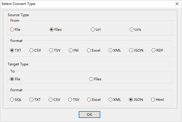 Select source TXT files -> Set JSON file -> Merge multiple TXT files into one JSON file