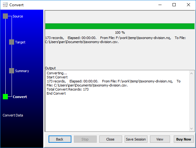 - Save session and create .bat (Windows) or .sh (Linux/macOS) file for “RDF N-Quads to CSV” conversion.
