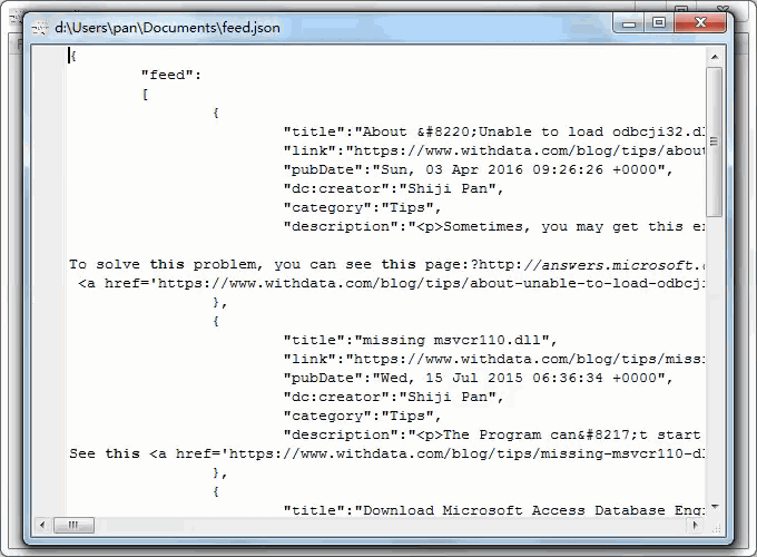 Try Withdata Data File Converter, a desktop RSS to JSON converter for Windows, MacOS, and Linux, Convert online RSS feed to JSON, Easy and Fast.