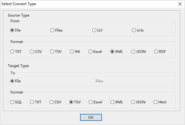 Choose XML file -> Set TSV file -> Convert XML to TSV